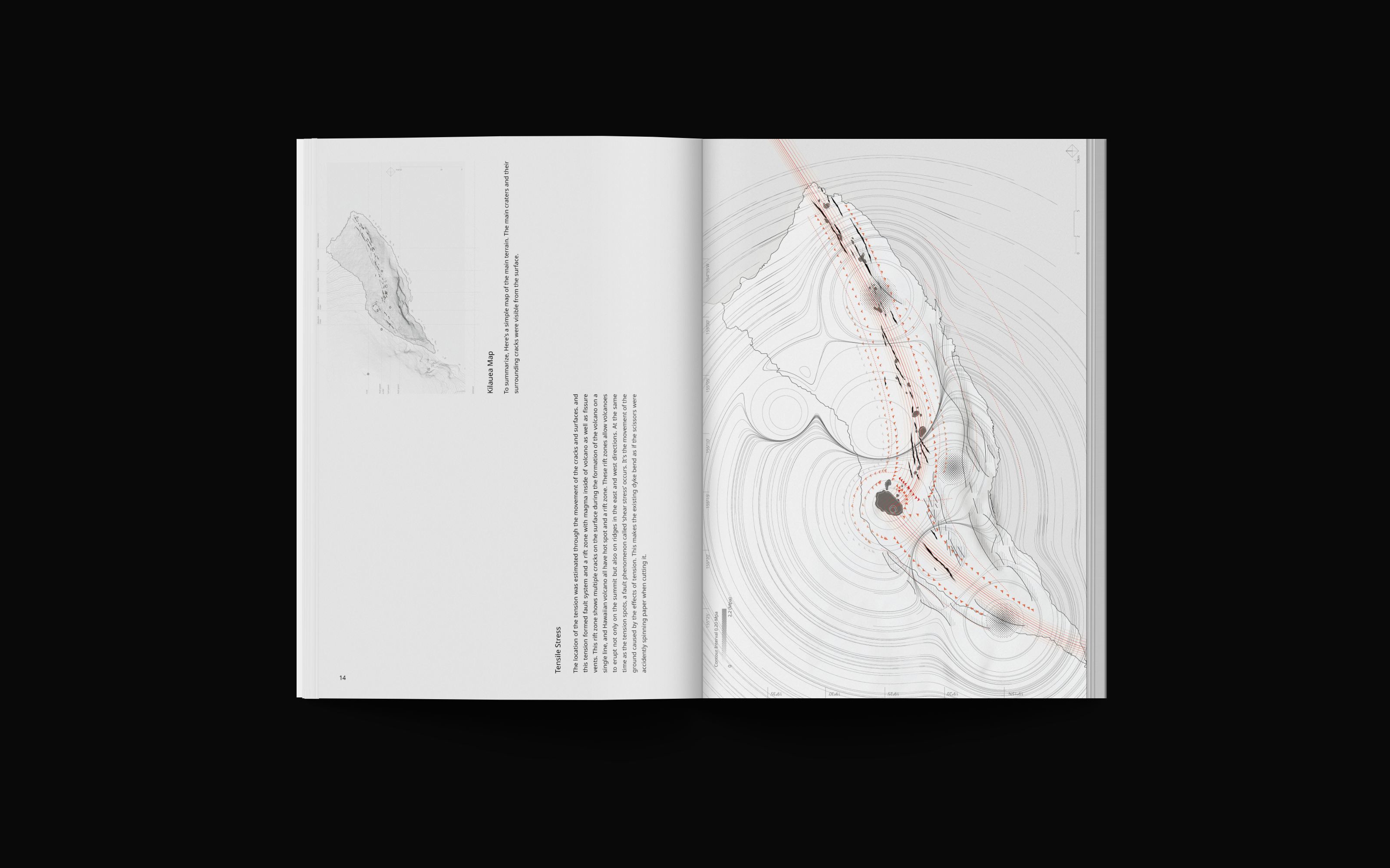 조사를 통해 균열과 표면의 움직임을 통해 장력의 위치를 추정했고 이 장력은 단층계와 화산 내부의 마그마에 균열을 형성했습니다.