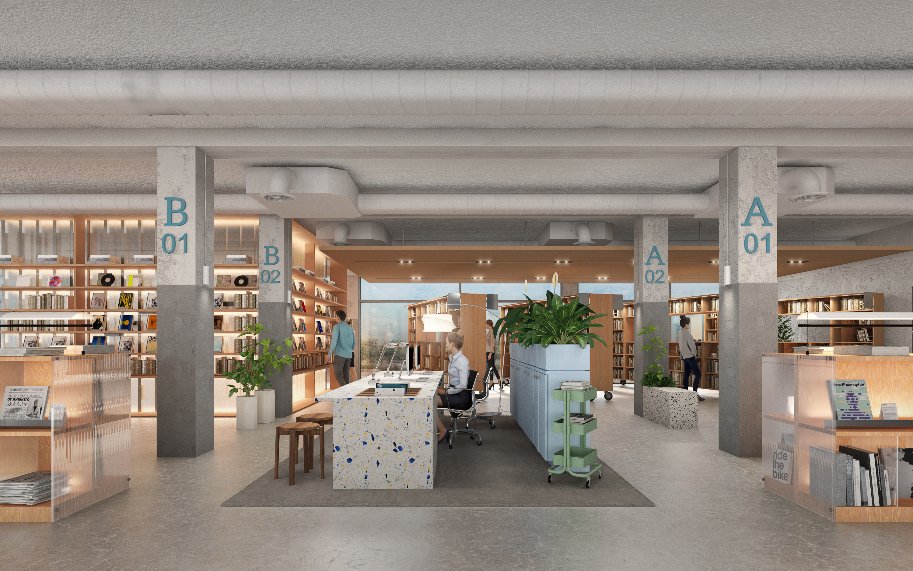 도서관은 책장에 꽂혀 있는 책뿐만 아니라, 사서에 의해 선별된 된 책을 디스플레이하여 로비 전시 공간이 연장되도록 했습니다. 이를 위해 계단, 가벽, 컨시어지의 책상의 구조적 요소를 이용하였고 신문, 잡지 등의 간행물, 도록, 독립서적 등 다양한 주제와 판형을 가진 도서가 잘 보이도록 집기를 디자인했습니다.