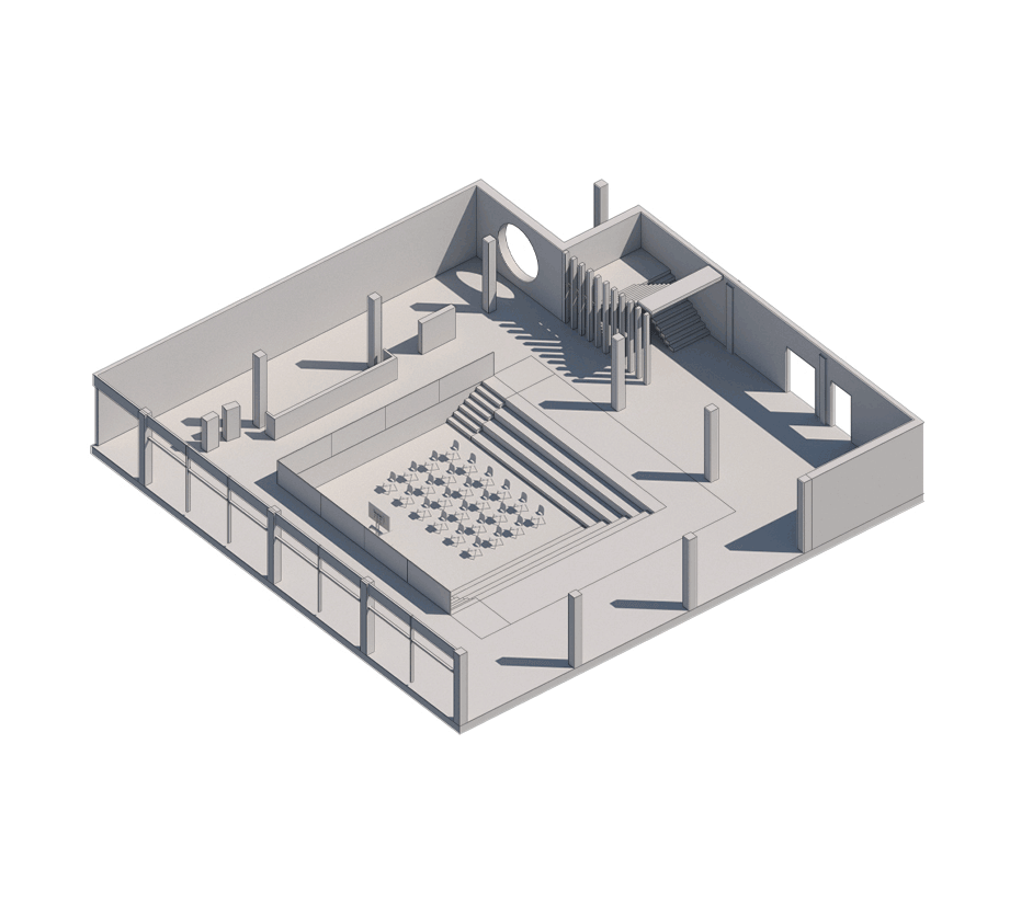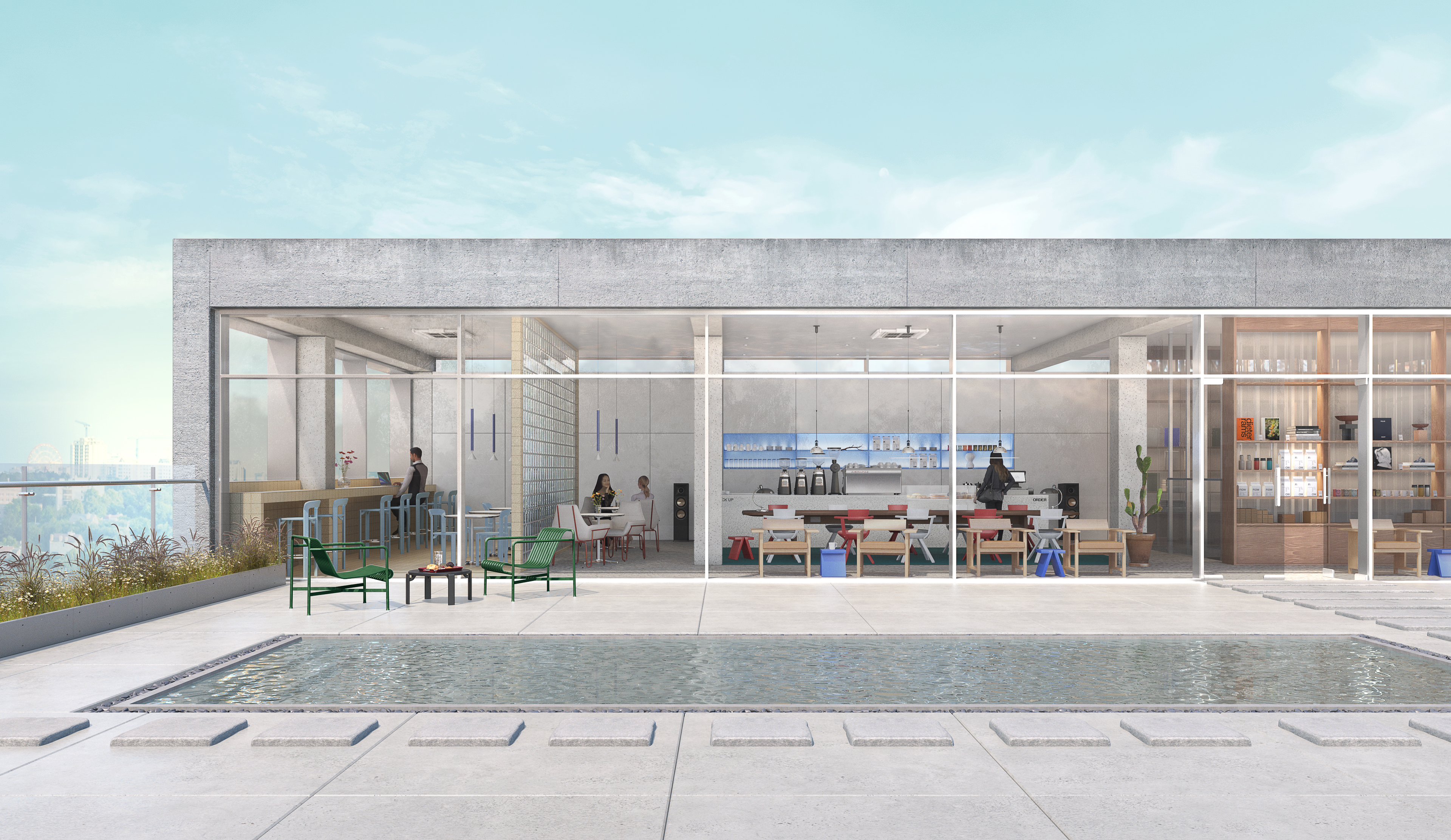 플로우 카페에서는 사람들은 자연적 요소와 조우하고 만남과 시선이 교차하는 경험을 합니다. 계단을 통해 1층 도서관, 2층 강의실을 지나오며 이전과는 대비되는 휴식의 공간을 마주합니다. 플로우에서 고요한 집중의 시간 이후, 정신적 이완과 사회적 접속의 가치를 일깨우며, 야외 정원과 함께 모험 할 수 있는 자유의 가능성을 느끼게 됩니다.
